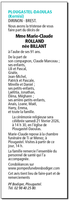 Décédée à Guilers (29820, France) le mercredi 18 février 2026 à l'âge de 90 ans