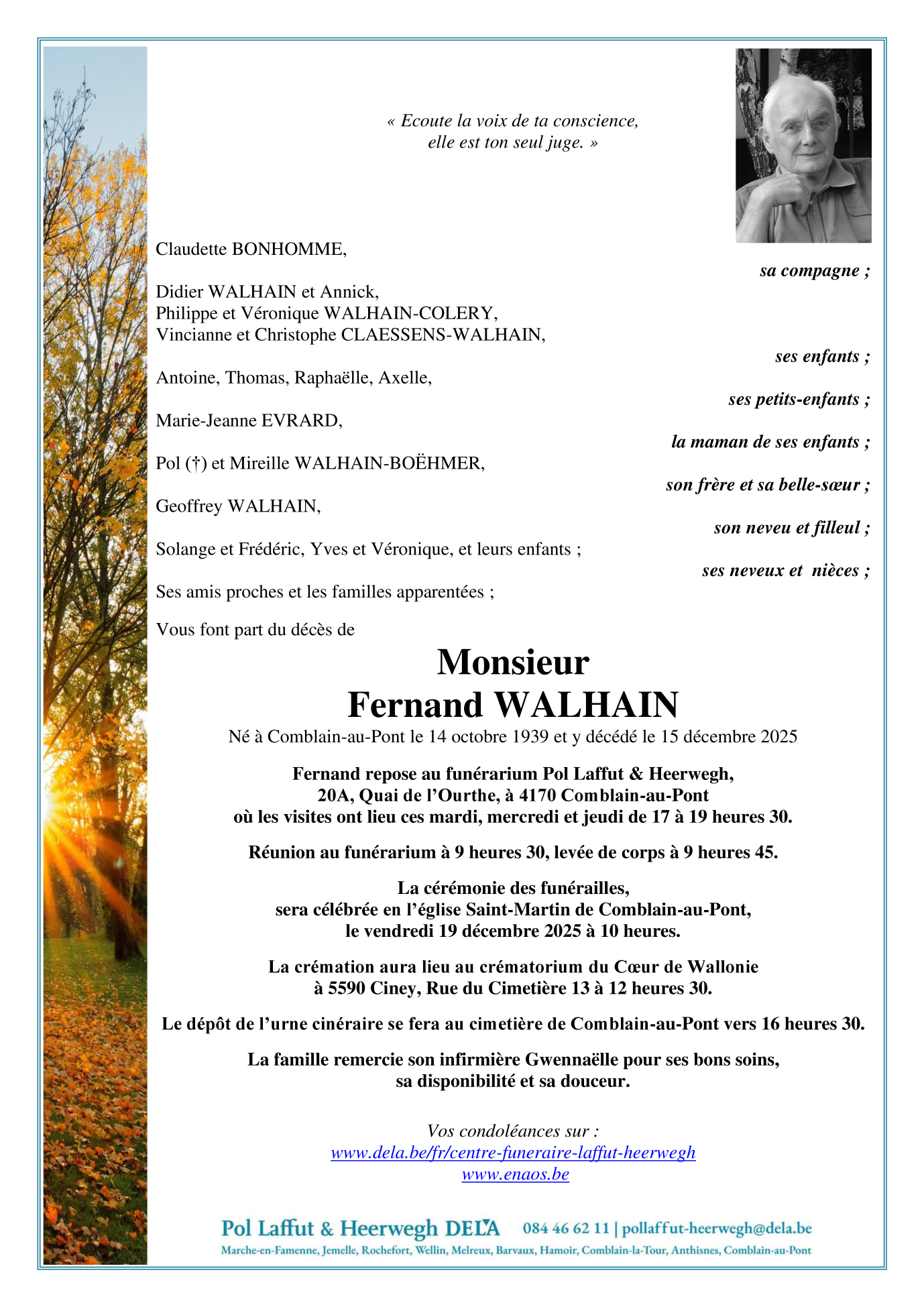 Died in Comblain-au-Pont (4170, Belgium) on 15 December 2025 at the age of 86 years