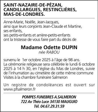 Décédée à Montpellier (34000, France) le mercredi 1 octobre 2025 à l'âge de 98 ans