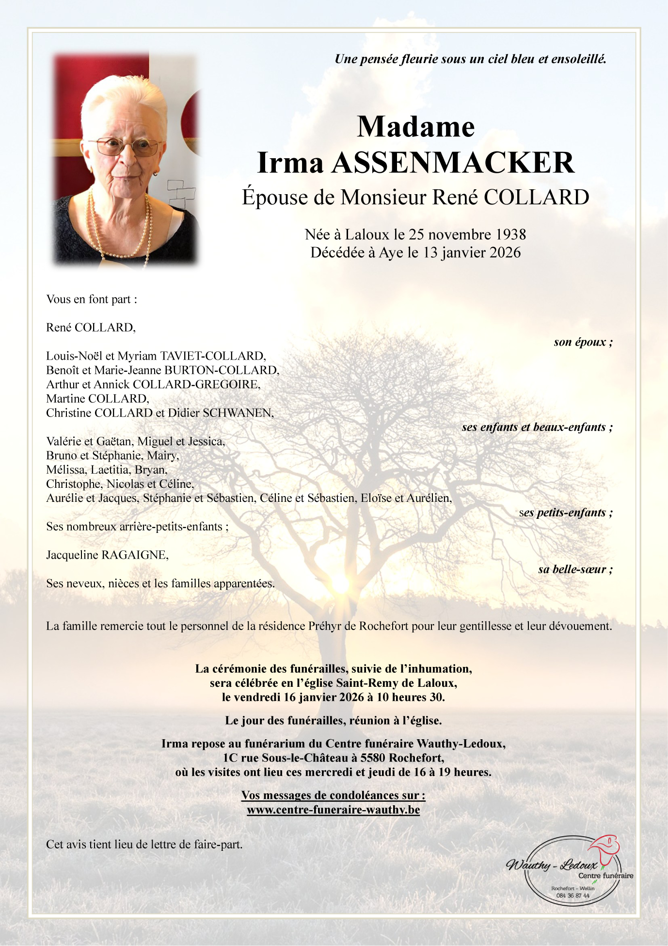 Décédée à Aye (6900, Belgique) le mardi 13 janvier 2026 à l'âge de 87 ans