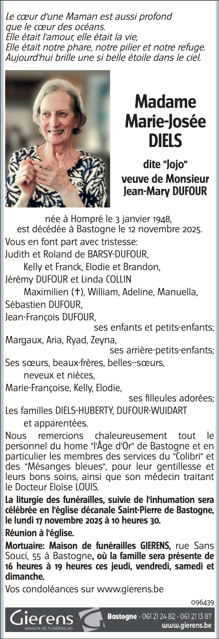 Décédée à Bastogne (6600, Belgique) le mercredi 12 novembre 2025 à l'âge de 77 ans