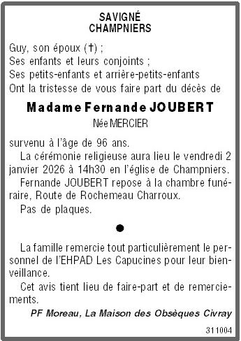 Décédée à Civray (86400, France) le vendredi 26 décembre 2025 à l'âge de 96 ans