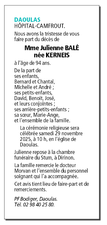 Décédée à Brest (29200, France) le mercredi 26 novembre 2025 à l'âge de 94 ans