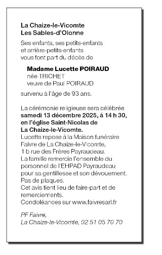 Died in La Chaize-le-Vicomte (85310, France) on 10 December 2025 at the age of 93 years