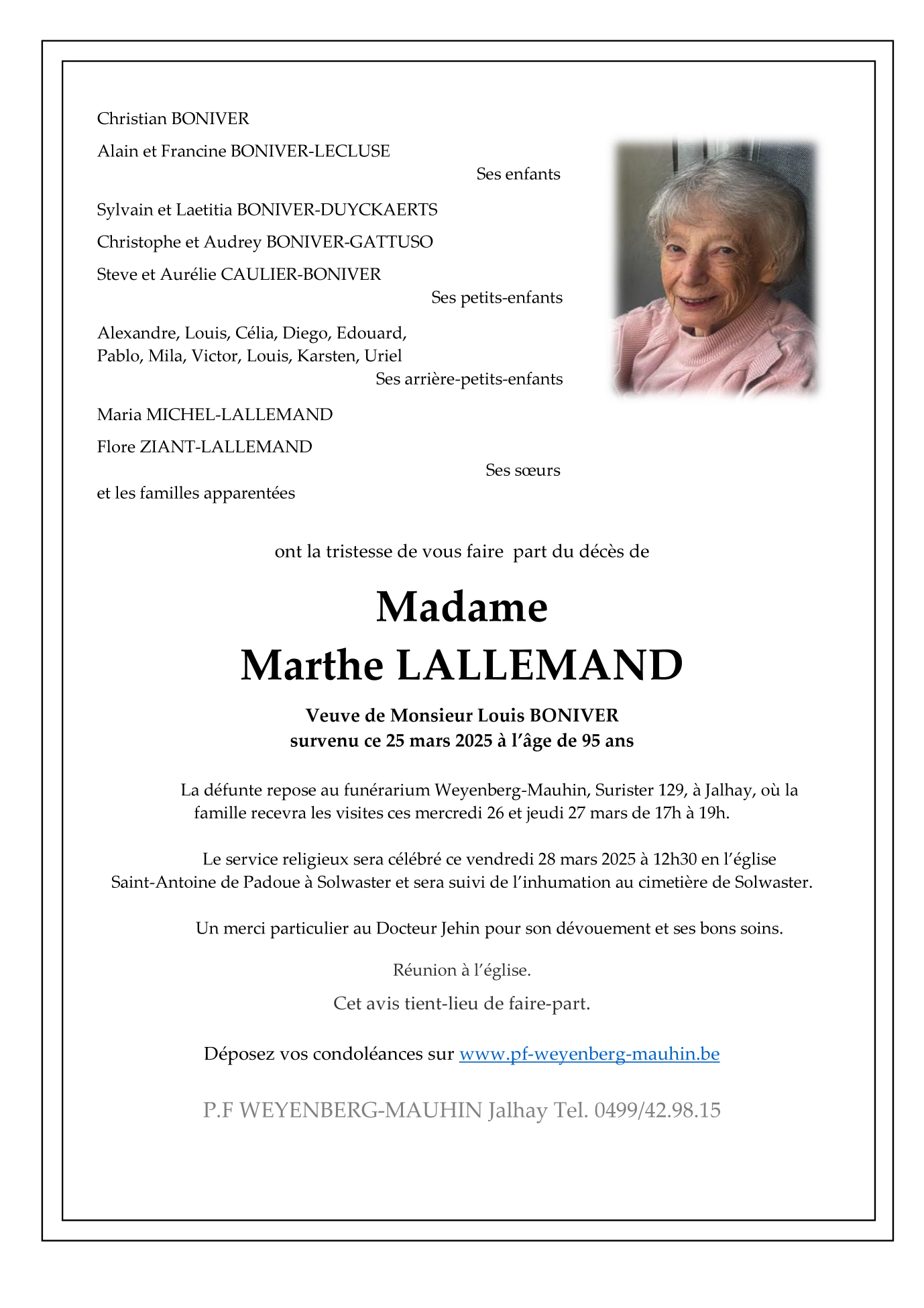 Veuve de Monsieur Louis BONIVER