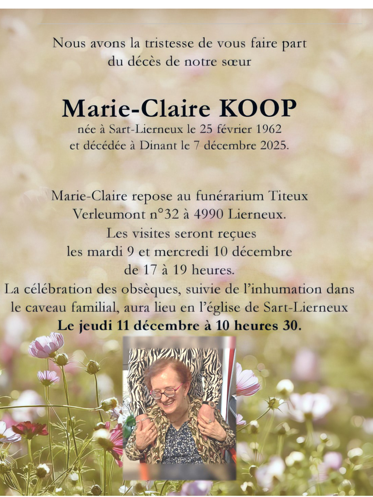 Décédée à Dinant (5500, Belgique) le dimanche 7 décembre 2025 à l'âge de 63 ans