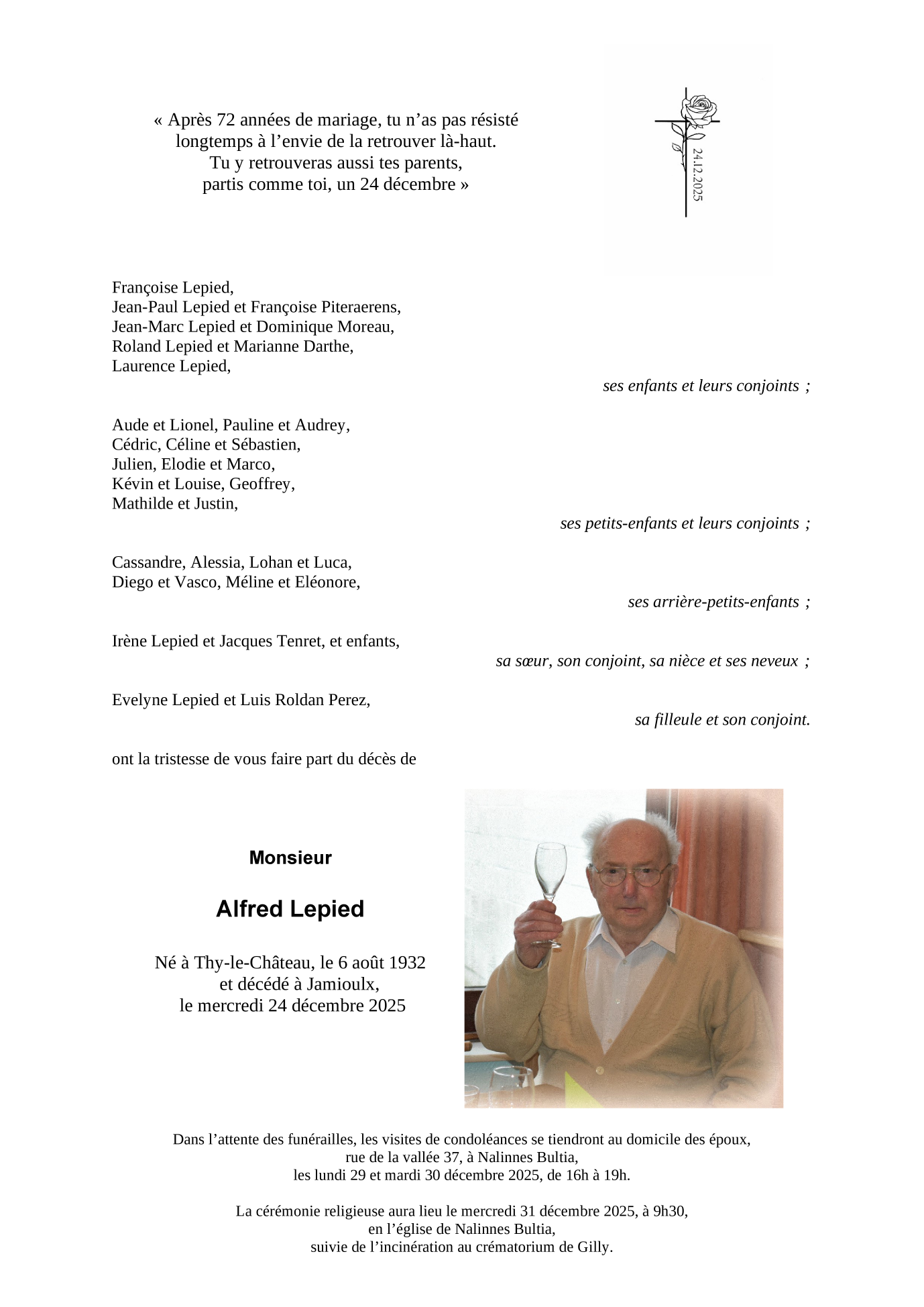 Décédé à Jamioulx (6120, Belgique) le mercredi 24 décembre 2025 à l'âge de 93 ans