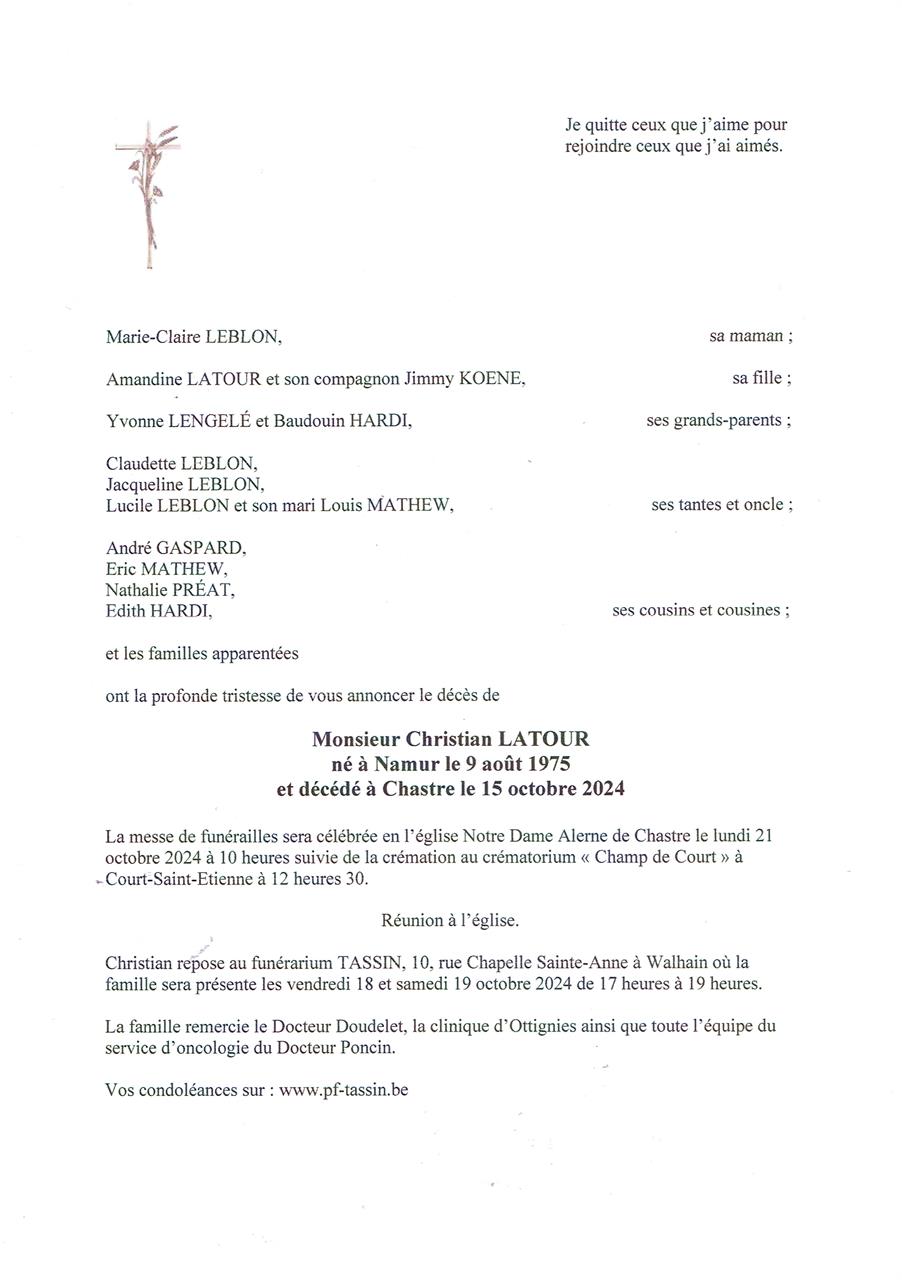 Décédé à Chastre (1450, Belgique) le mardi 15 octobre 2024 à l'âge de 48 ans
