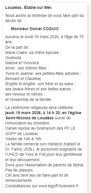 Overleden te Saint-Brieuc (22000, Frankrijk) op maandag 16 maart 2026 op 75-jarige leeftijd