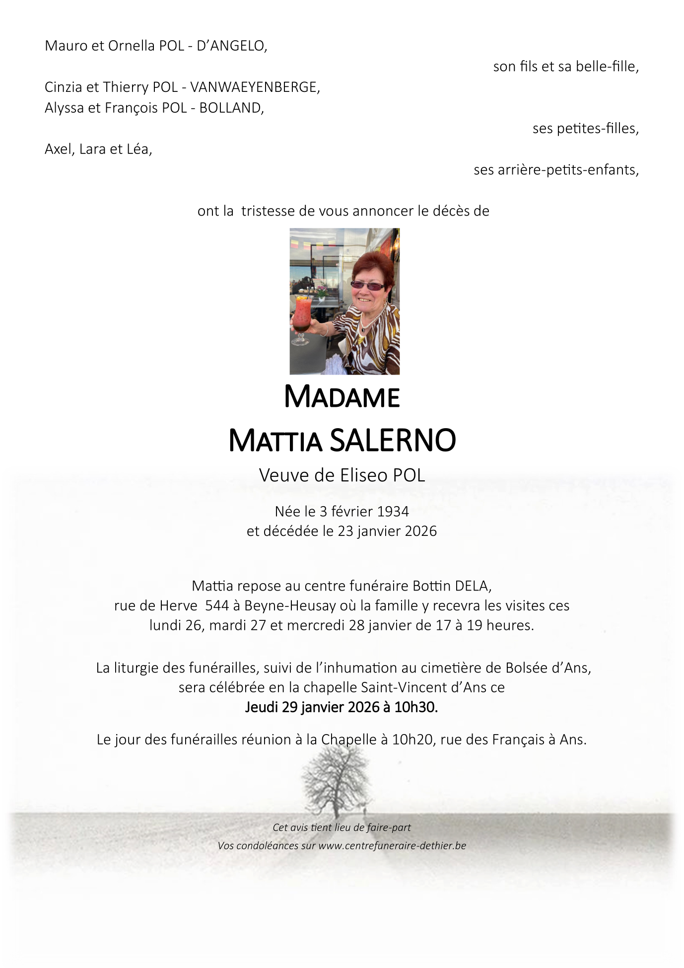 Décédée à Liège (4020, Belgique) le vendredi 23 janvier 2026 à l'âge de 91 ans