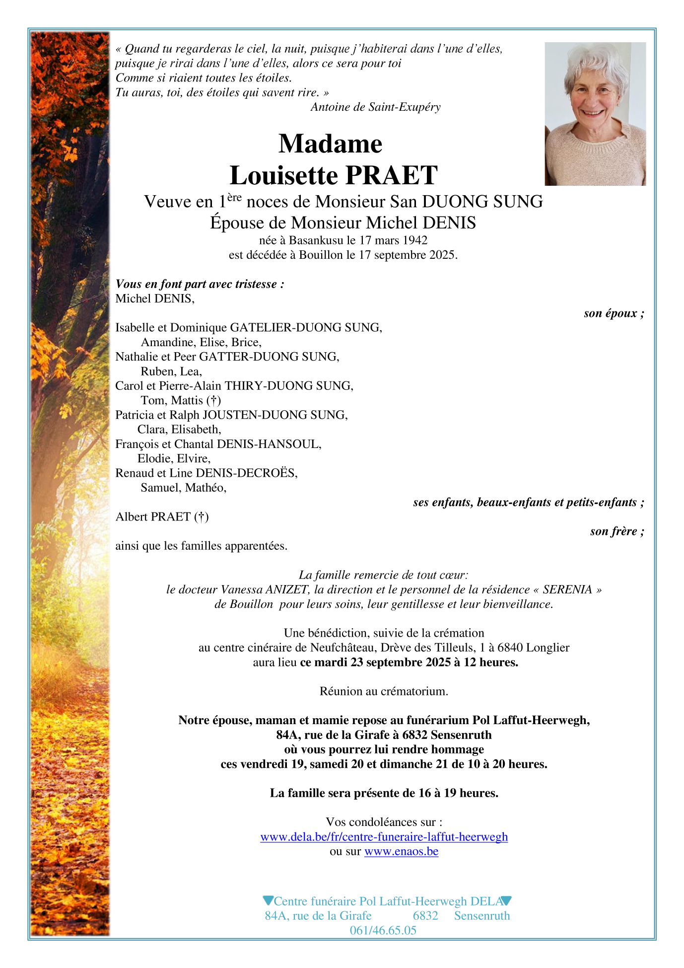 Décédée à Bouillon (6830, Belgique) le mercredi 17 septembre 2025 à l'âge de 83 ans