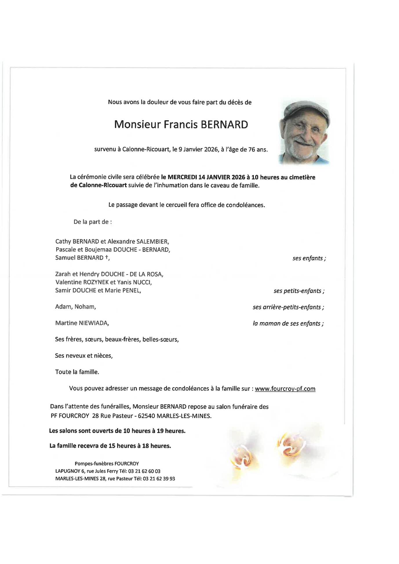 Décédé à Calonne-Ricouart (62470, France) le vendredi 9 janvier 2026 à l'âge de 76 ans