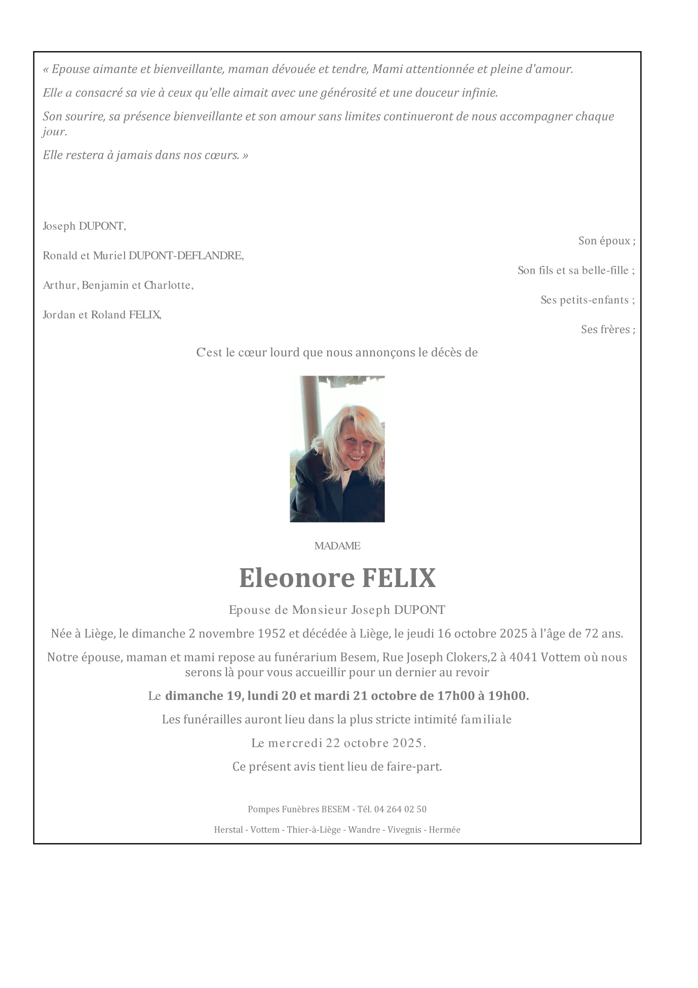 Décédée à Liège (4000, Belgique) le jeudi 16 octobre 2025 à l'âge de 72 ans