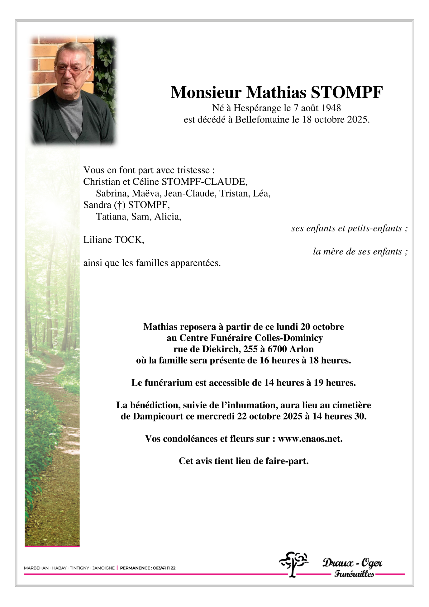 Died in Bellefontaine (Lux.) (6730, Belgium) on 18 October 2025 at the age of 77 years
