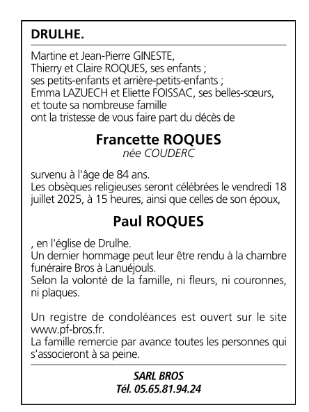 Madame Francette ROQUES née COUDERC