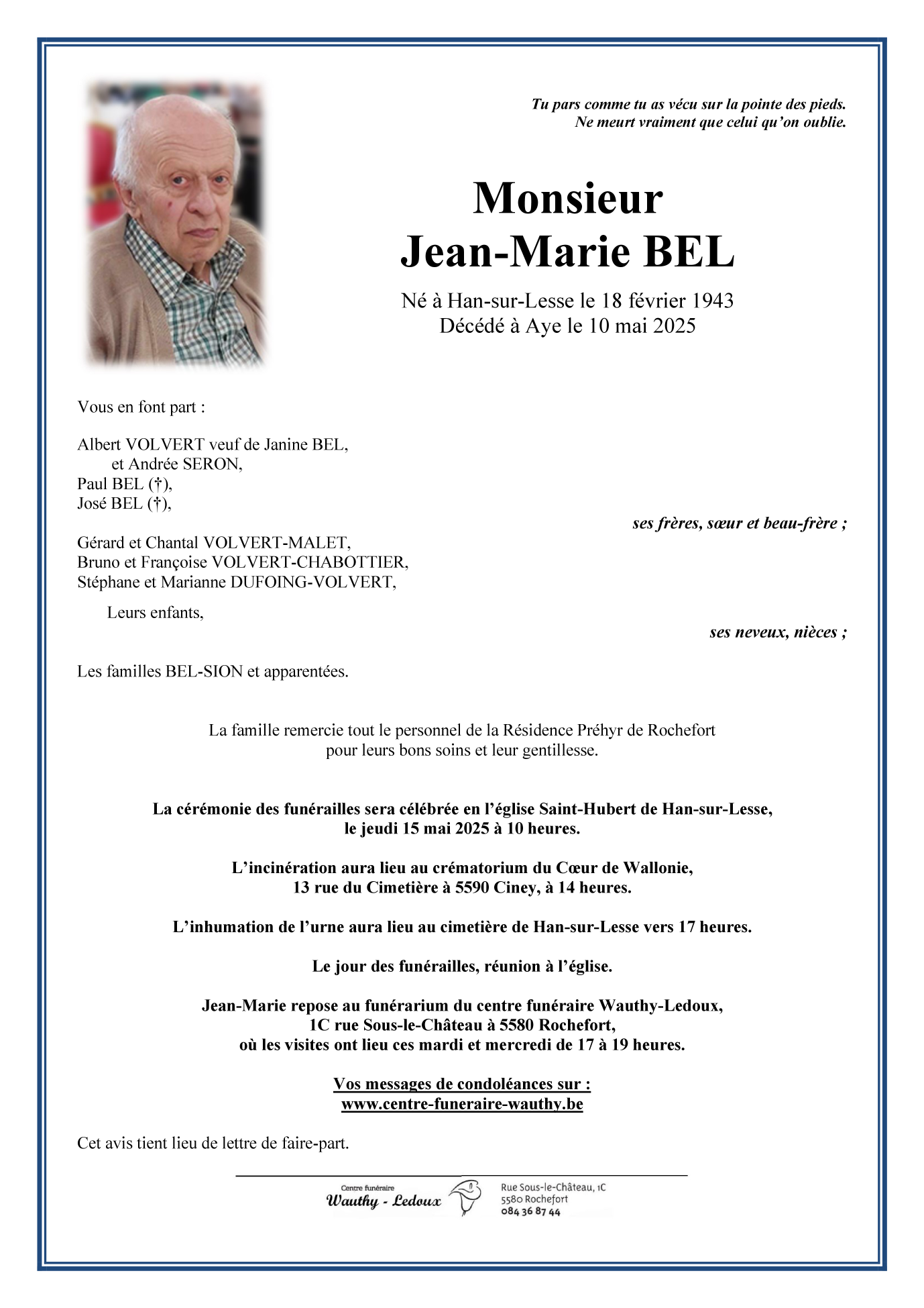 Died in Aye (6900, Belgium) on 10 May 2025 at the age of 82 years