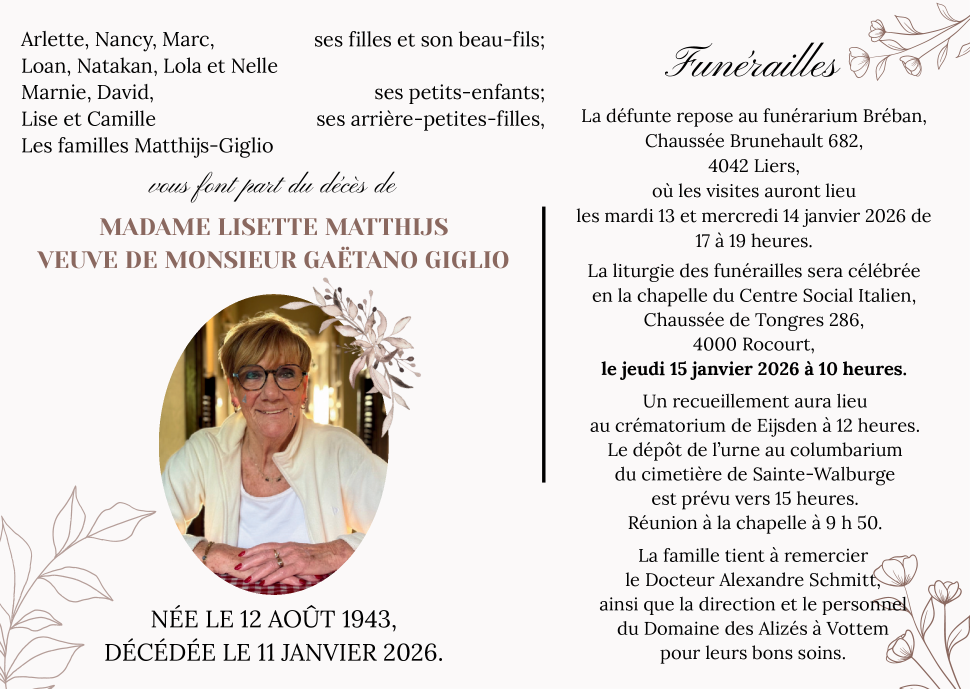 Décédée à Vottem (4041, Belgique) le dimanche 11 janvier 2026 à l'âge de 82 ans