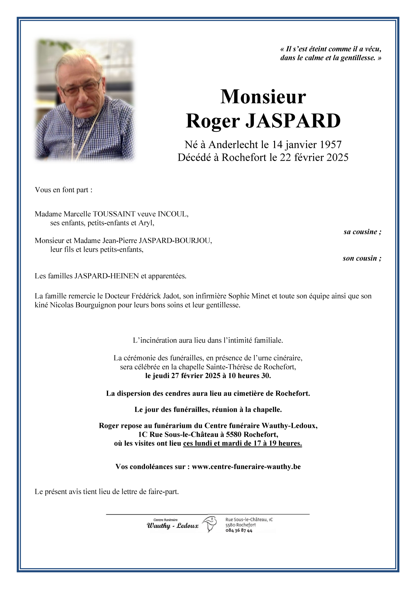 Décédé à Rochefort (5580, Belgique) le samedi 22 février 2025 à l'âge de 68 ans
