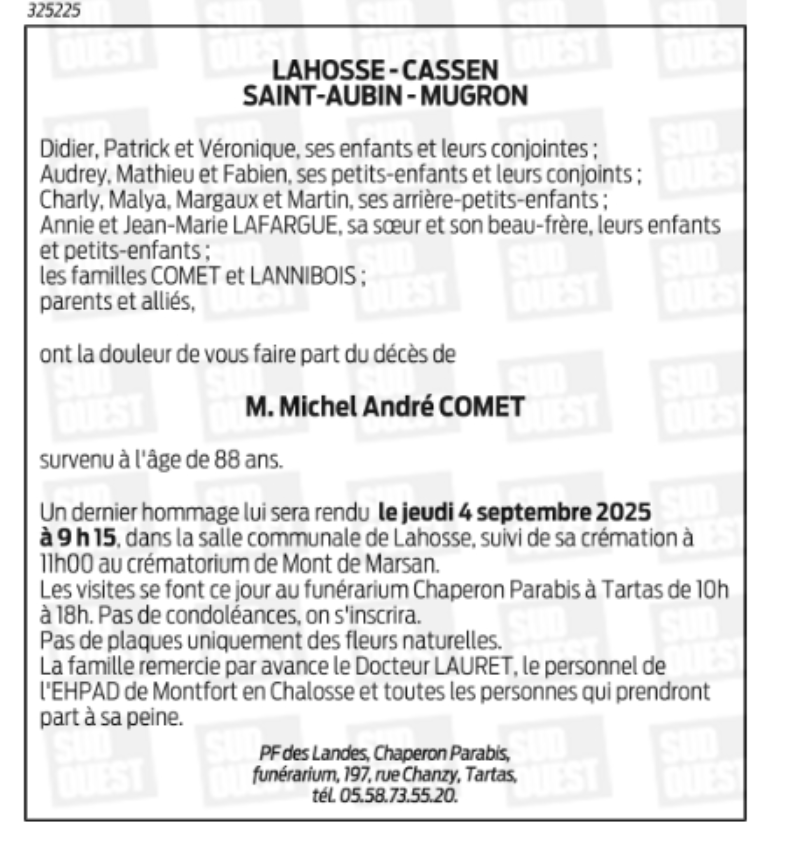Died in Dax (40100, France) on 31 August 2025 at the age of 88 years