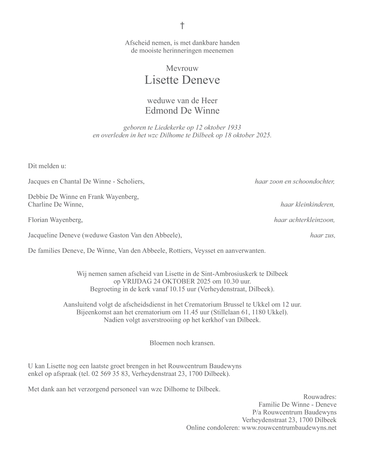 Décédée à Dilbeek (1700, Belgique) le samedi 18 octobre 2025 à l'âge de 92 ans