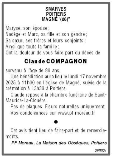 Died in Poitiers (86000, France) on 12 November 2025 at the age of 80 years