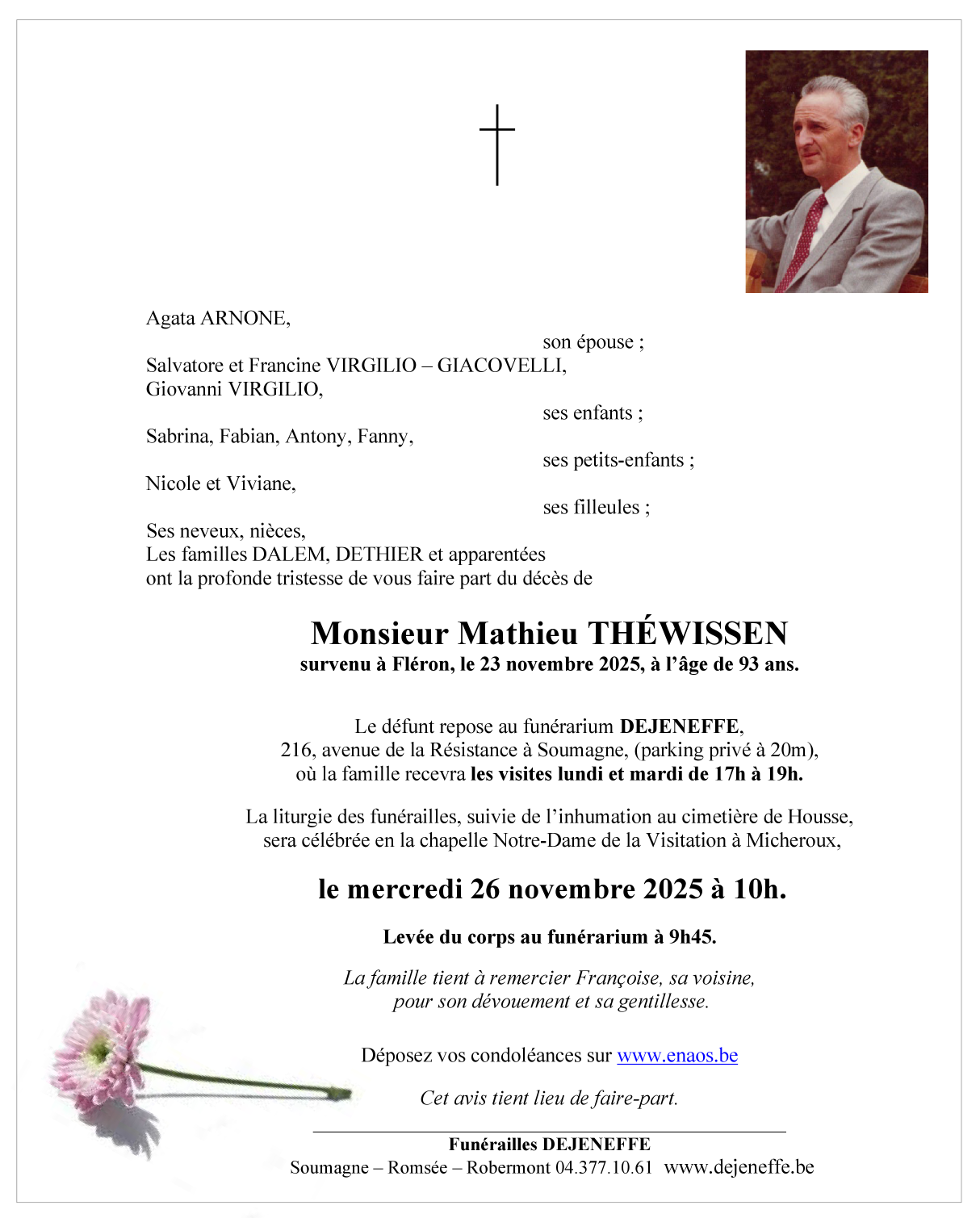 Décédé à Fléron (4620, Belgique) le dimanche 23 novembre 2025 à l'âge de 93 ans
