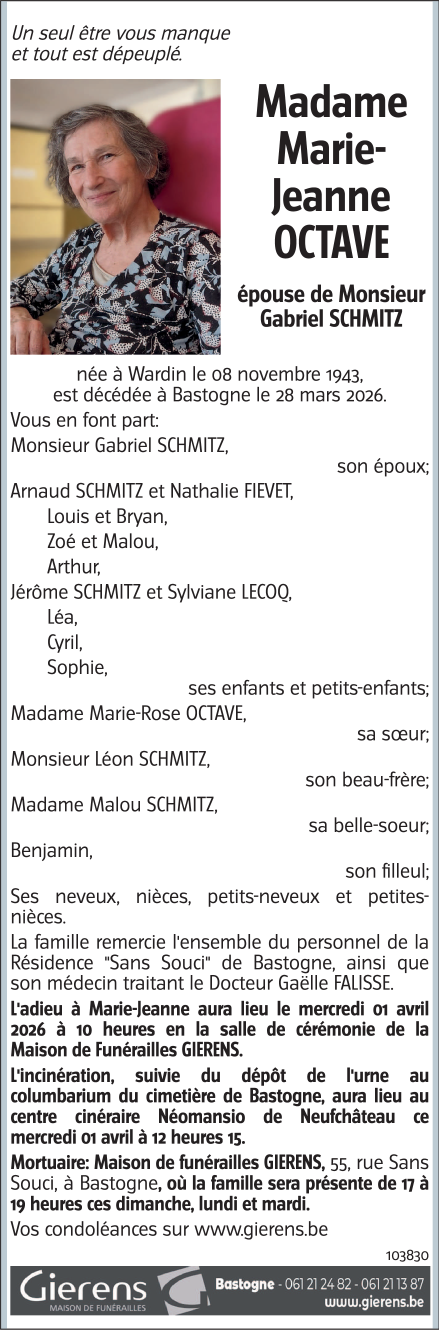 Décédée à Bastogne (6600, Belgique) le samedi 28 mars 2026 à l'âge de 82 ans