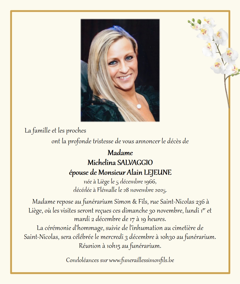 Décédée à Flémalle (4400, Belgique) le vendredi 28 novembre 2025 à l'âge de 58 ans