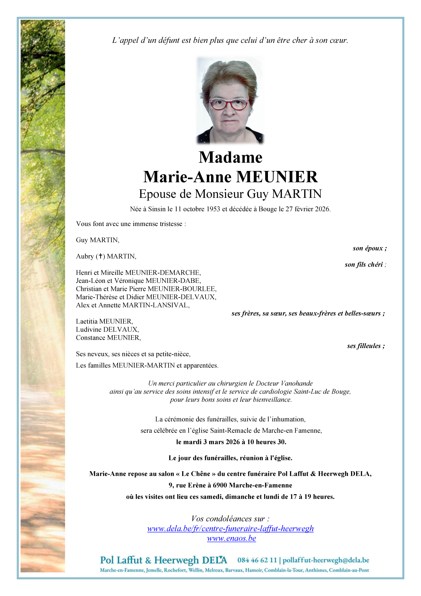 Décédée à Bouge (5004, Belgique) le vendredi 27 février 2026 à l'âge de 72 ans
