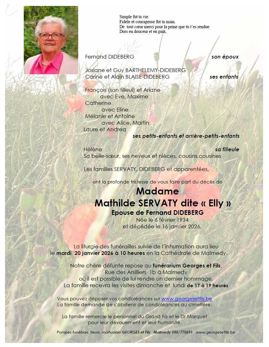 Décédée à Malmedy (4960, Belgique) le vendredi 16 janvier 2026 à l'âge de 91 ans