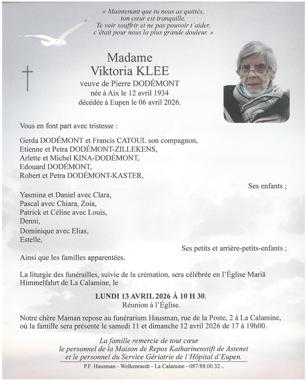 Décédée à Eupen (4700, Belgique) le lundi 6 avril 2026 à l'âge de 91 ans