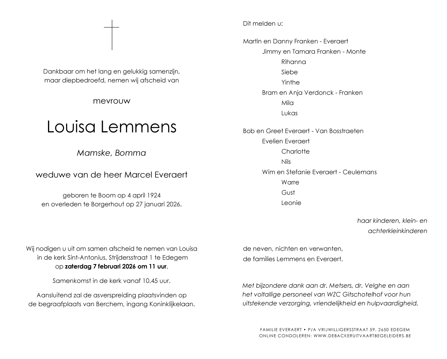Overleden te Borgerhout (Antwerpen) (2140, België) op dinsdag 27 januari 2026 op 101-jarige leeftijd