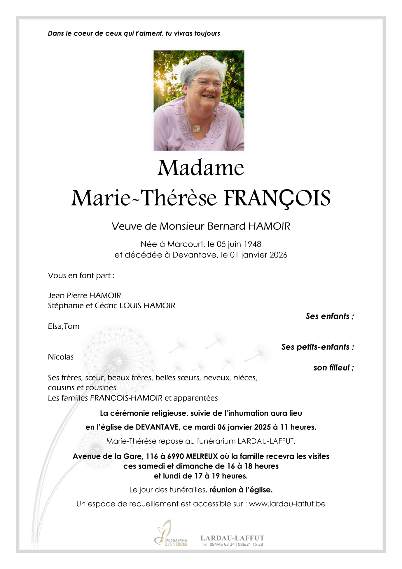 Décédée à Devantave (6987, Belgique) le jeudi 1 janvier 2026 à l'âge de 77 ans