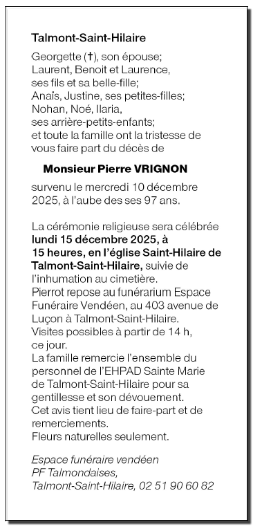Overleden te Talmont-Saint-Hilaire (85440, Frankrijk) op woensdag 10 december 2025 op 96-jarige leeftijd