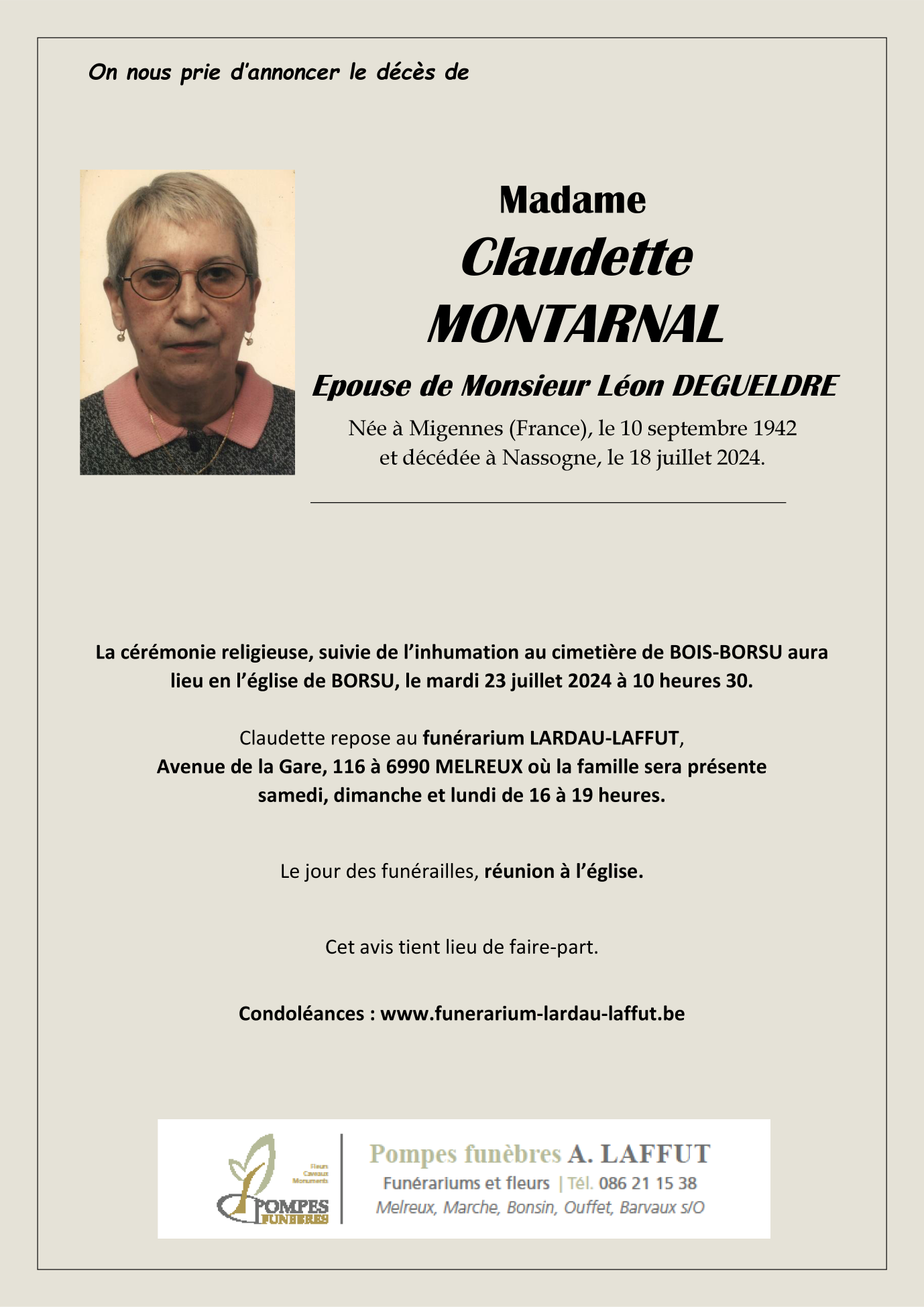 Décédée à Nassogne (6950, Belgique) le jeudi 18 juillet 2024 à l'âge de 81 ans