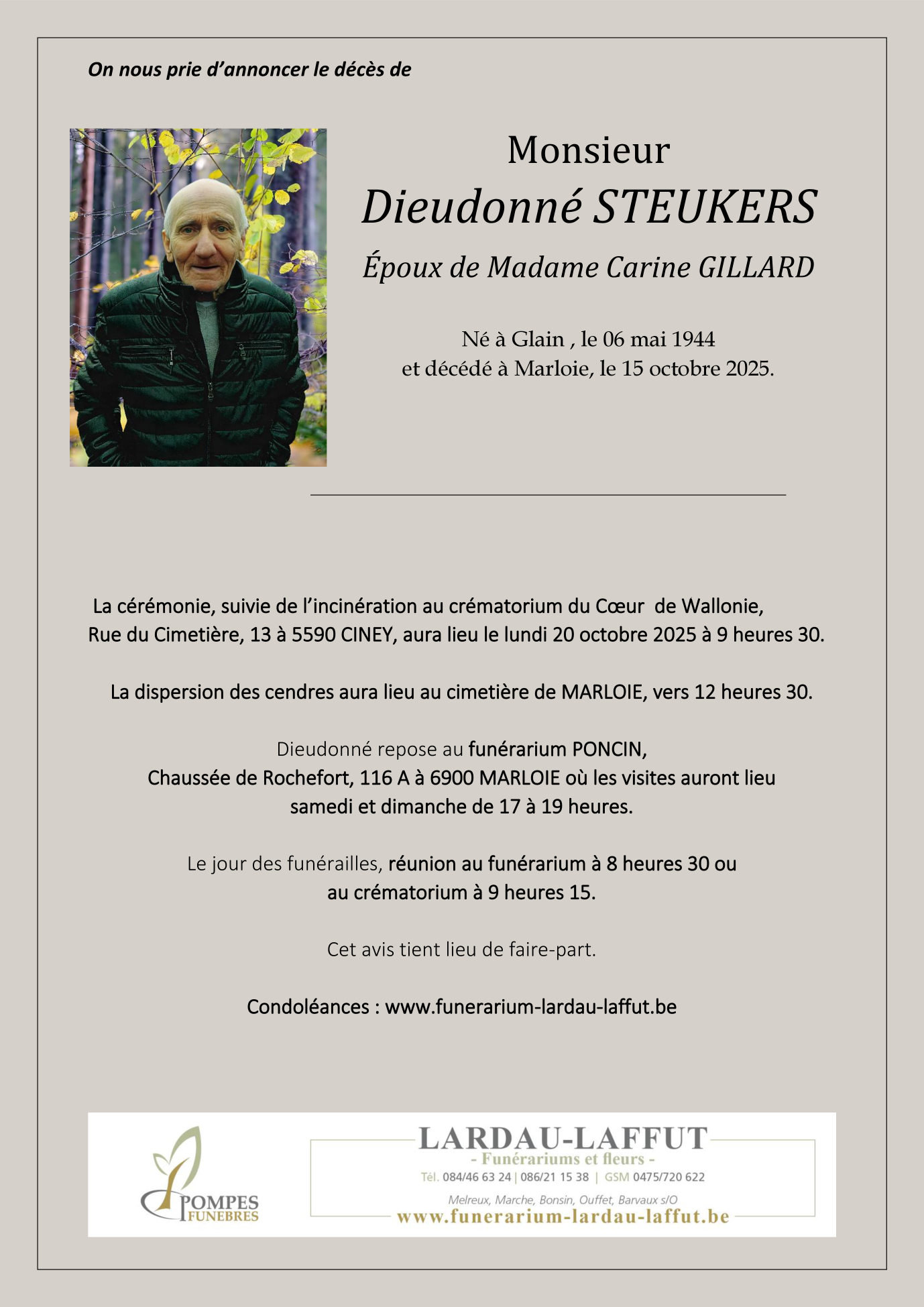 Overleden te Marloie (6900, België) op woensdag 15 oktober 2025 op 81-jarige leeftijd