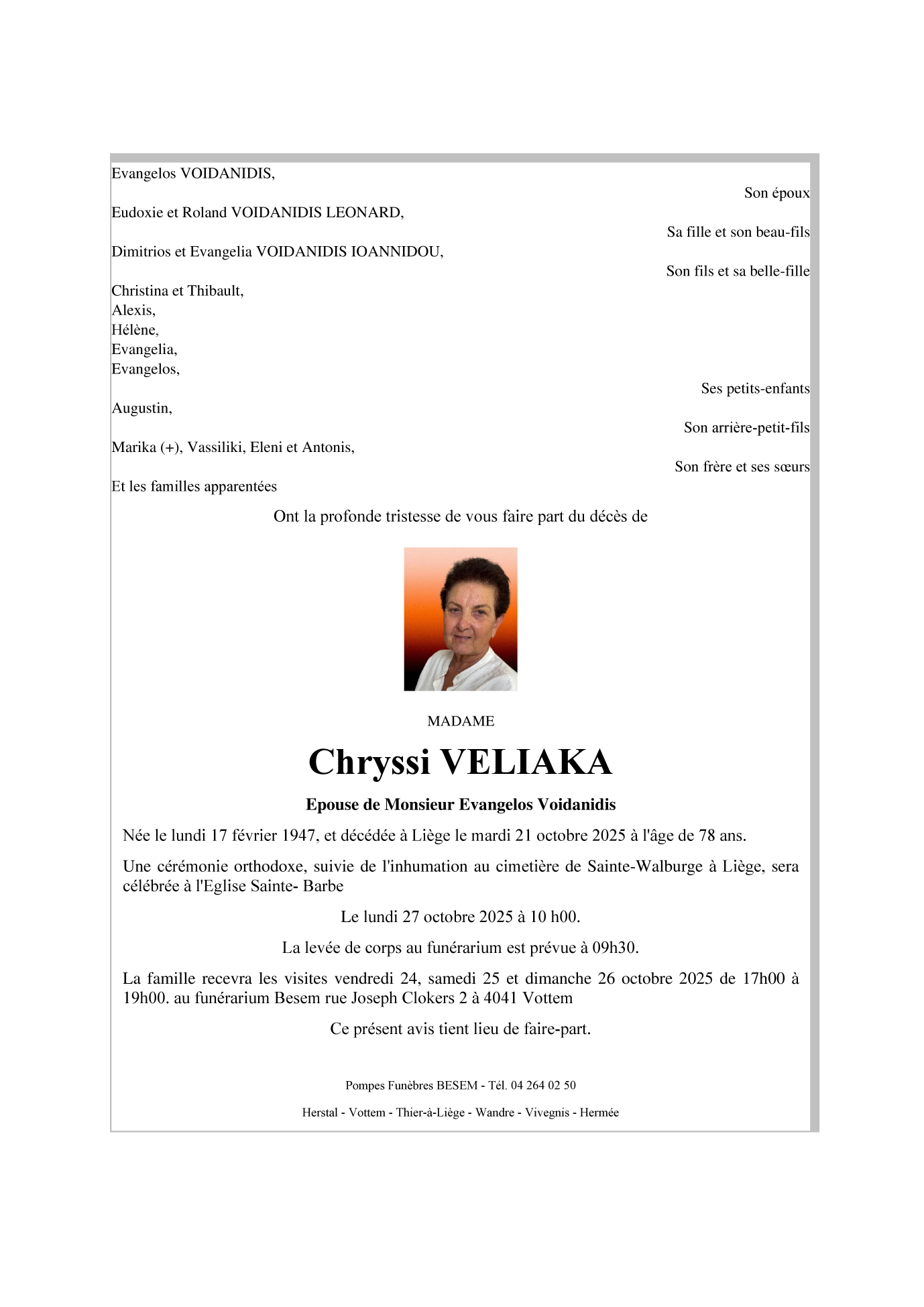 Décédée à Liège (4000, Belgique) le mardi 21 octobre 2025 à l'âge de 78 ans
