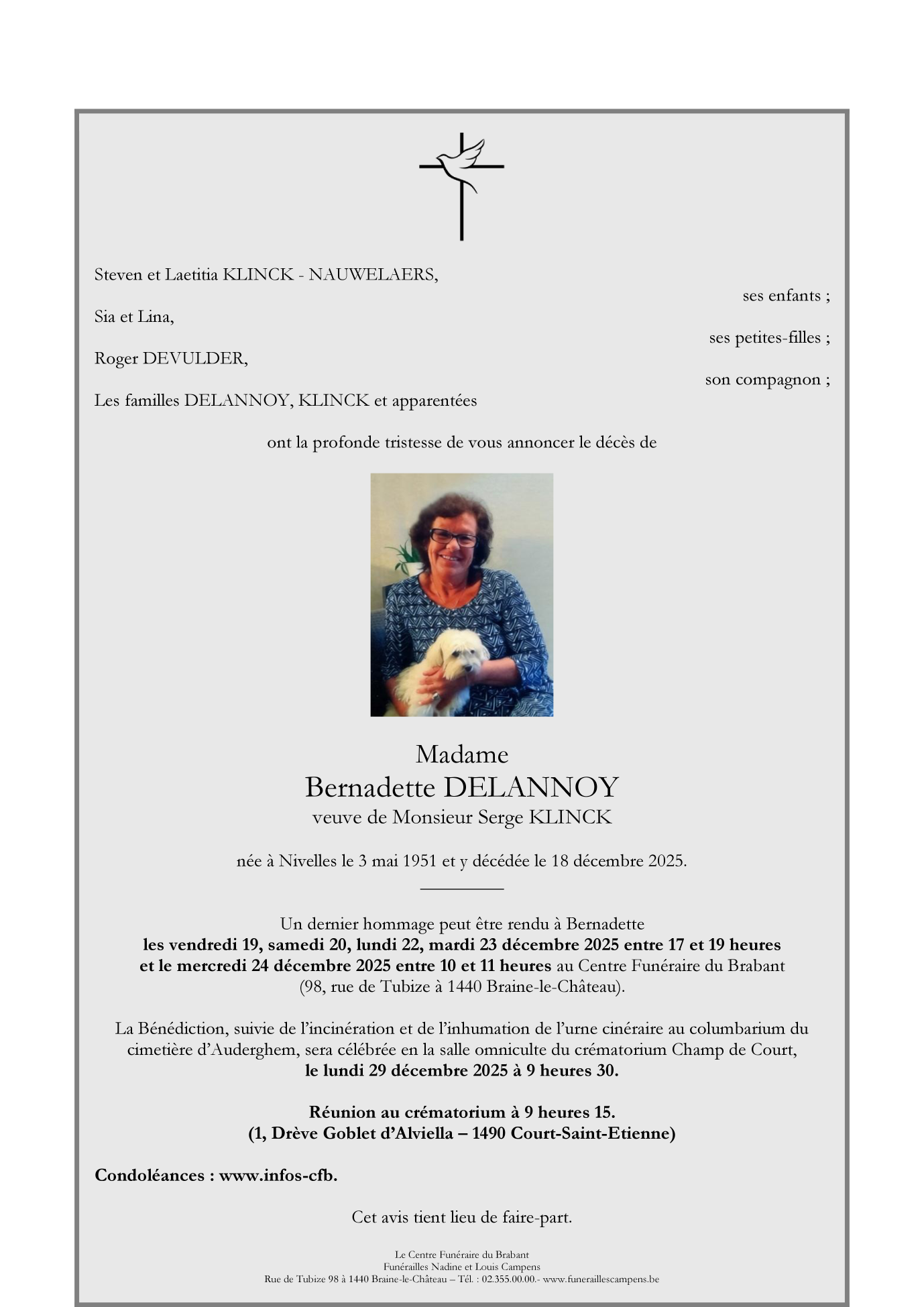 Décédée à Nivelles (1400, Belgique) le jeudi 18 décembre 2025 à l'âge de 74 ans