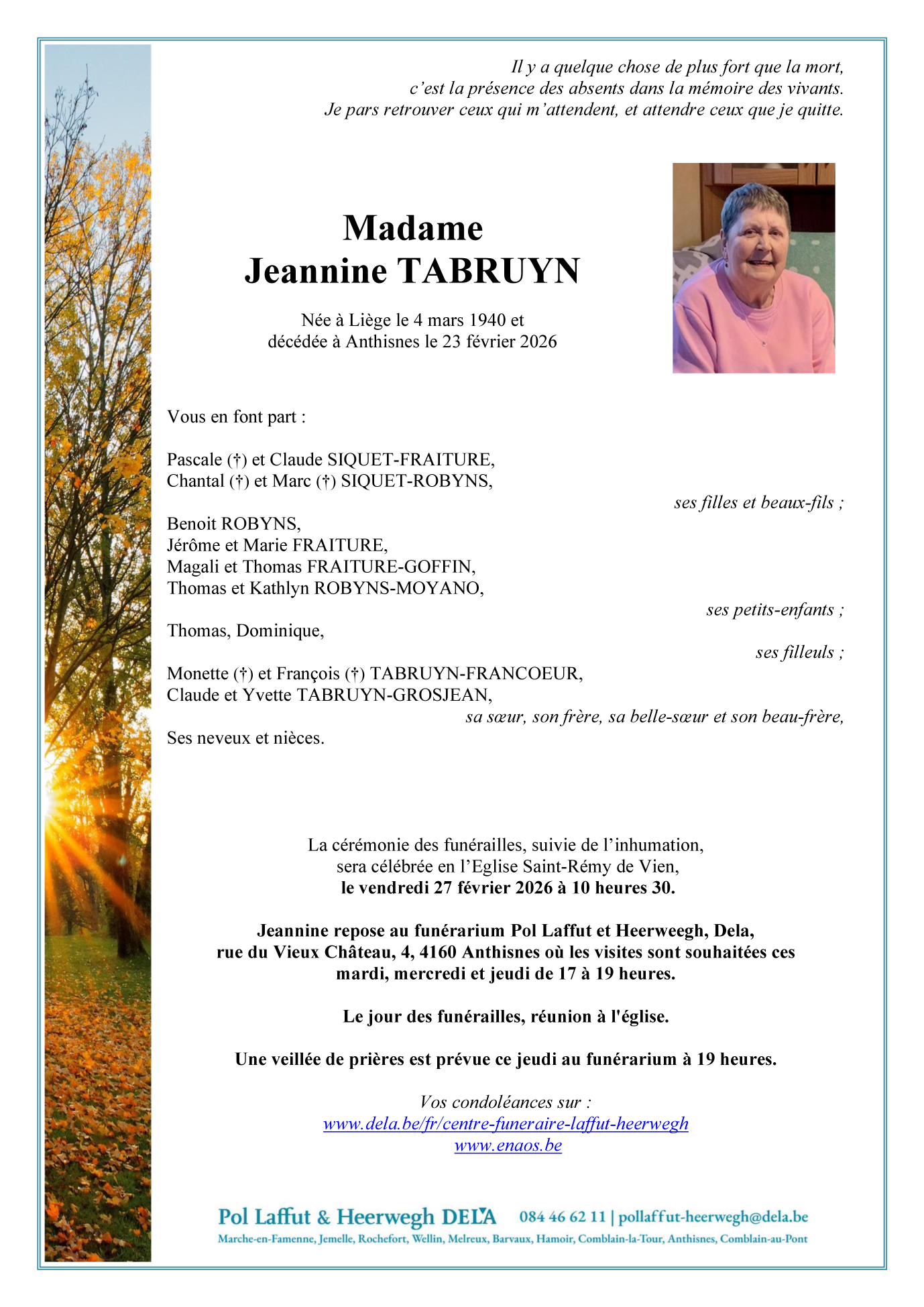 Décédée à Anthisnes (4160, Belgique) le lundi 23 février 2026 à l'âge de 85 ans