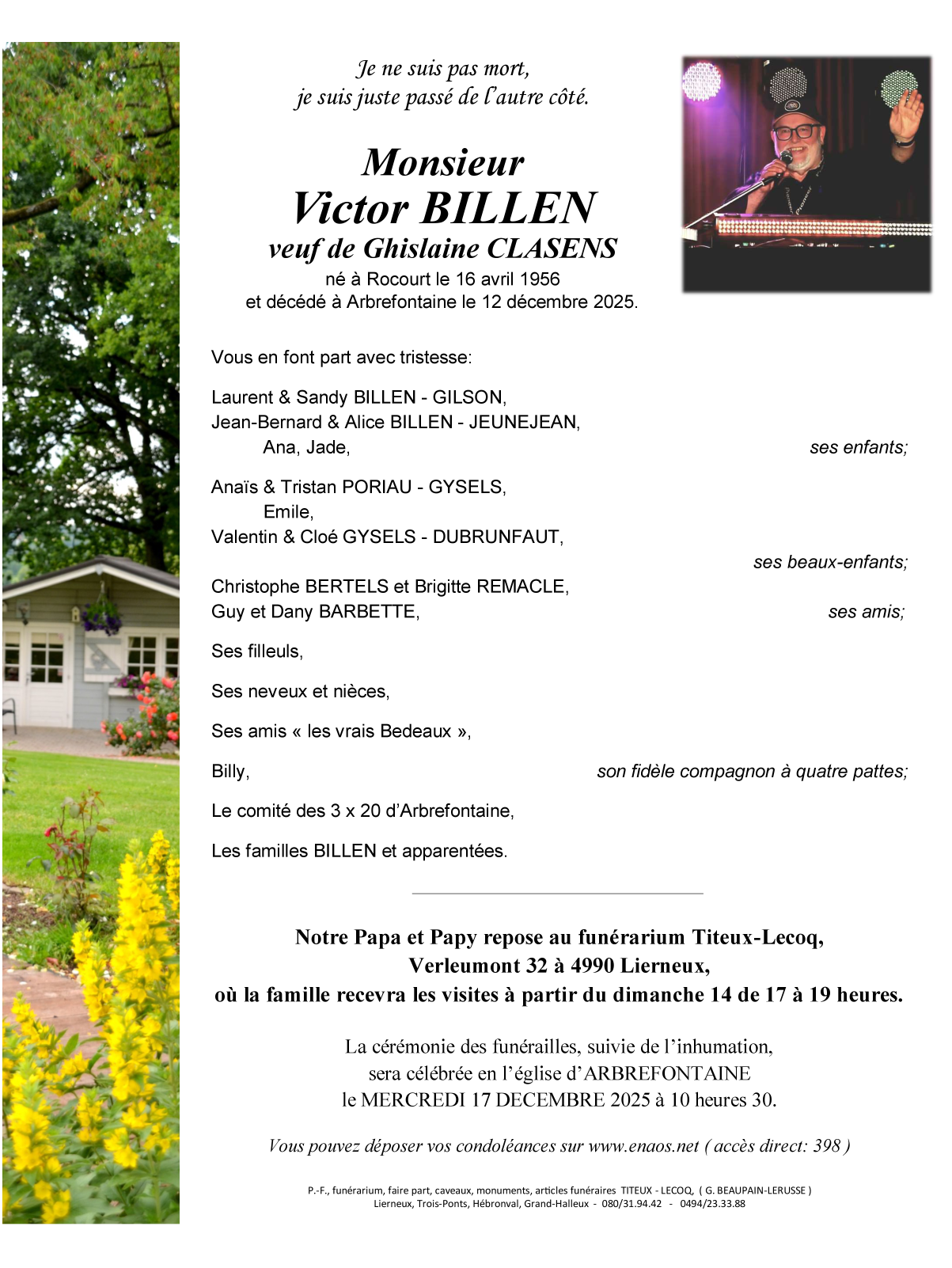 Décédé à Arbrefontaine (4990, Belgique) le vendredi 12 décembre 2025 à l'âge de 69 ans