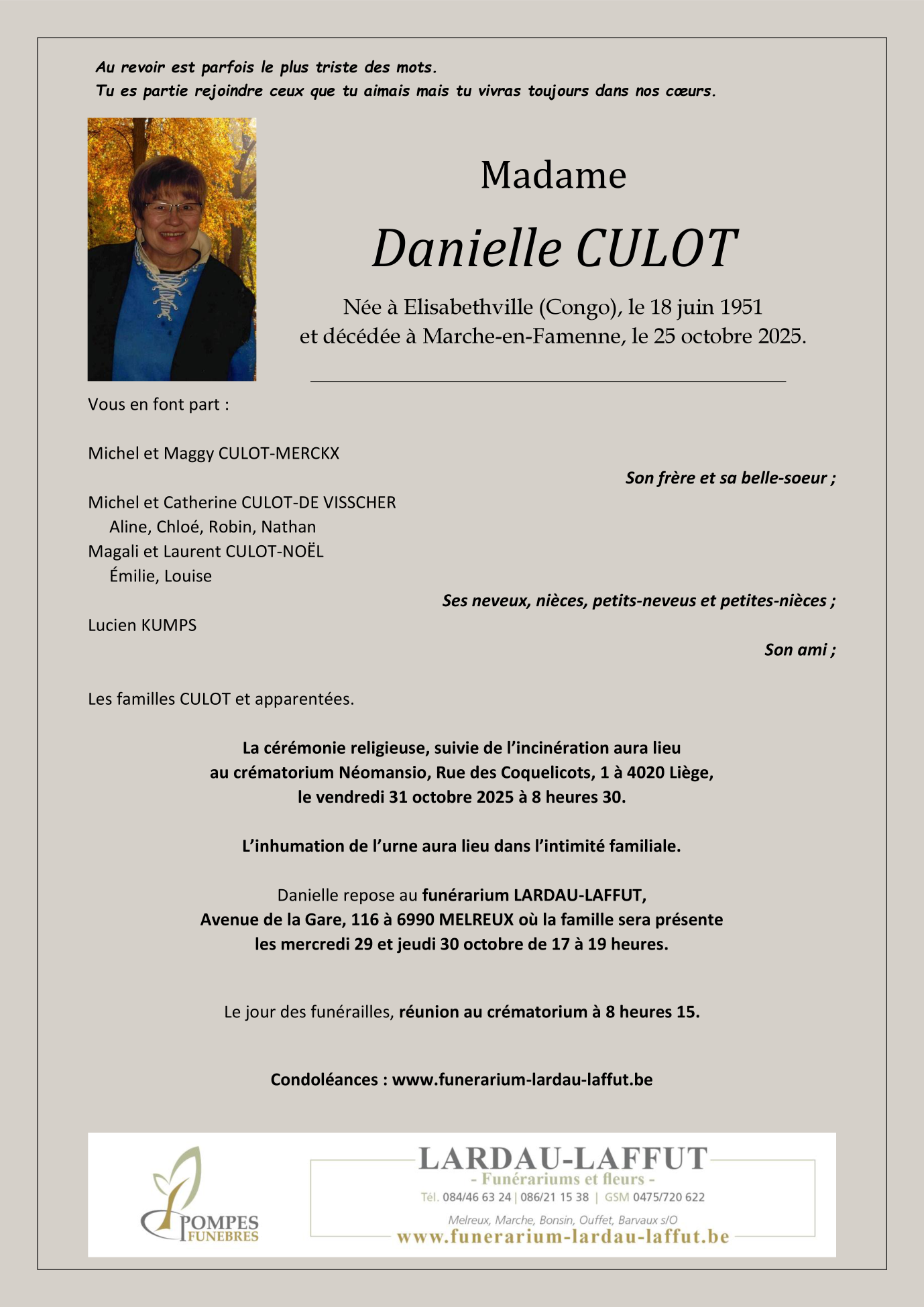 Died in Marche-en-Famenne (6900, Belgium) on 25 October 2025 at the age of 74 years