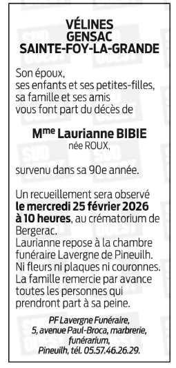 Décédée à Vélines (24230, France) le mardi 17 février 2026 à l'âge de 89 ans
