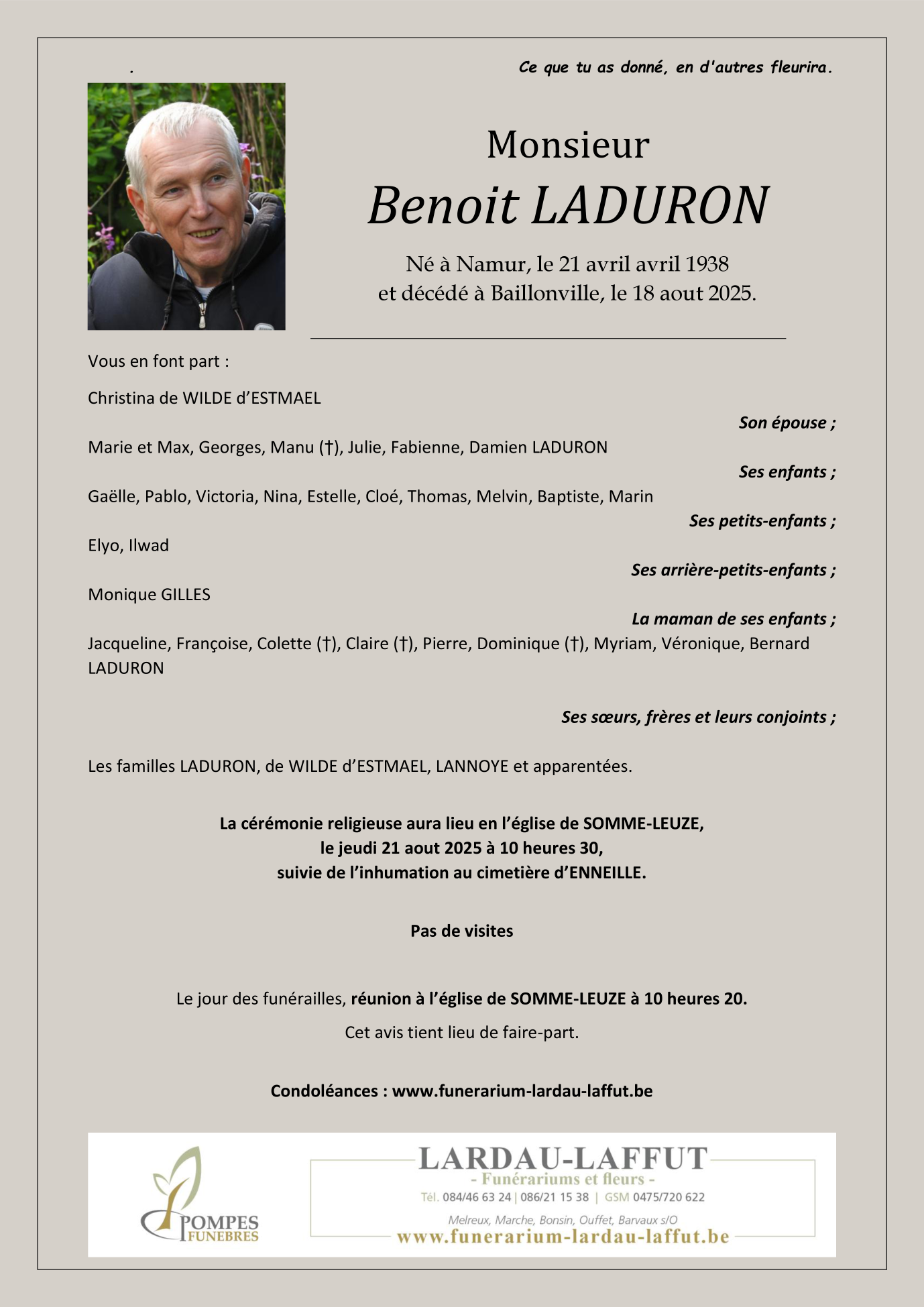 Died in Baillonville (5377, Belgium) on 18 August 2025 at the age of 87 years