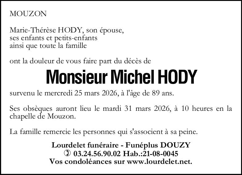 Décédé à Mouzon (08210, France) le mercredi 25 mars 2026 à l'âge de 89 ans