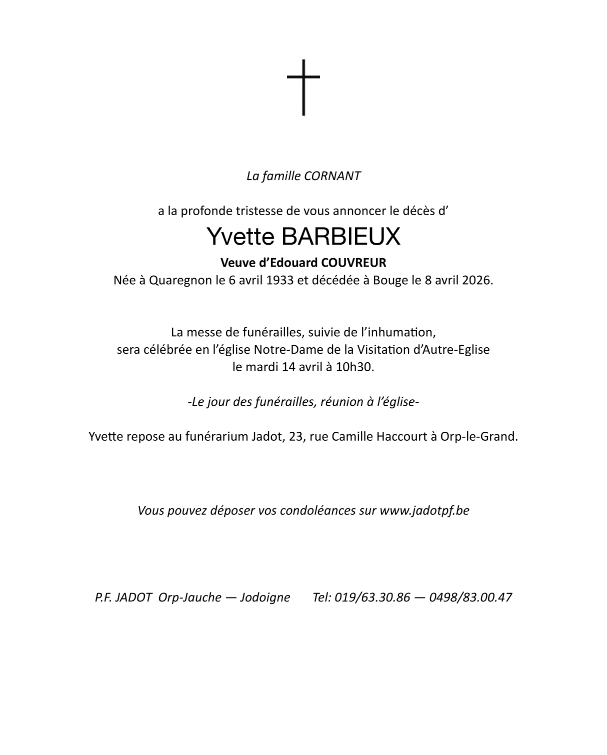 Décédée à Bouge (5004, Belgique) le mercredi 8 avril 2026 à l'âge de 93 ans