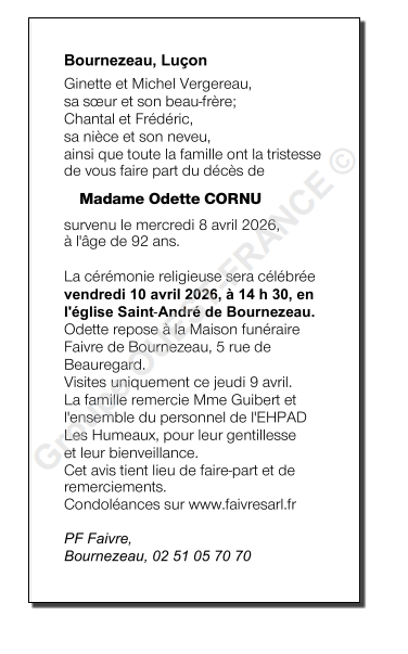 Fallecida en Bournezeau (85480, Francia) el miércoles, 8 de abril de 2026 a la edad de 92 años