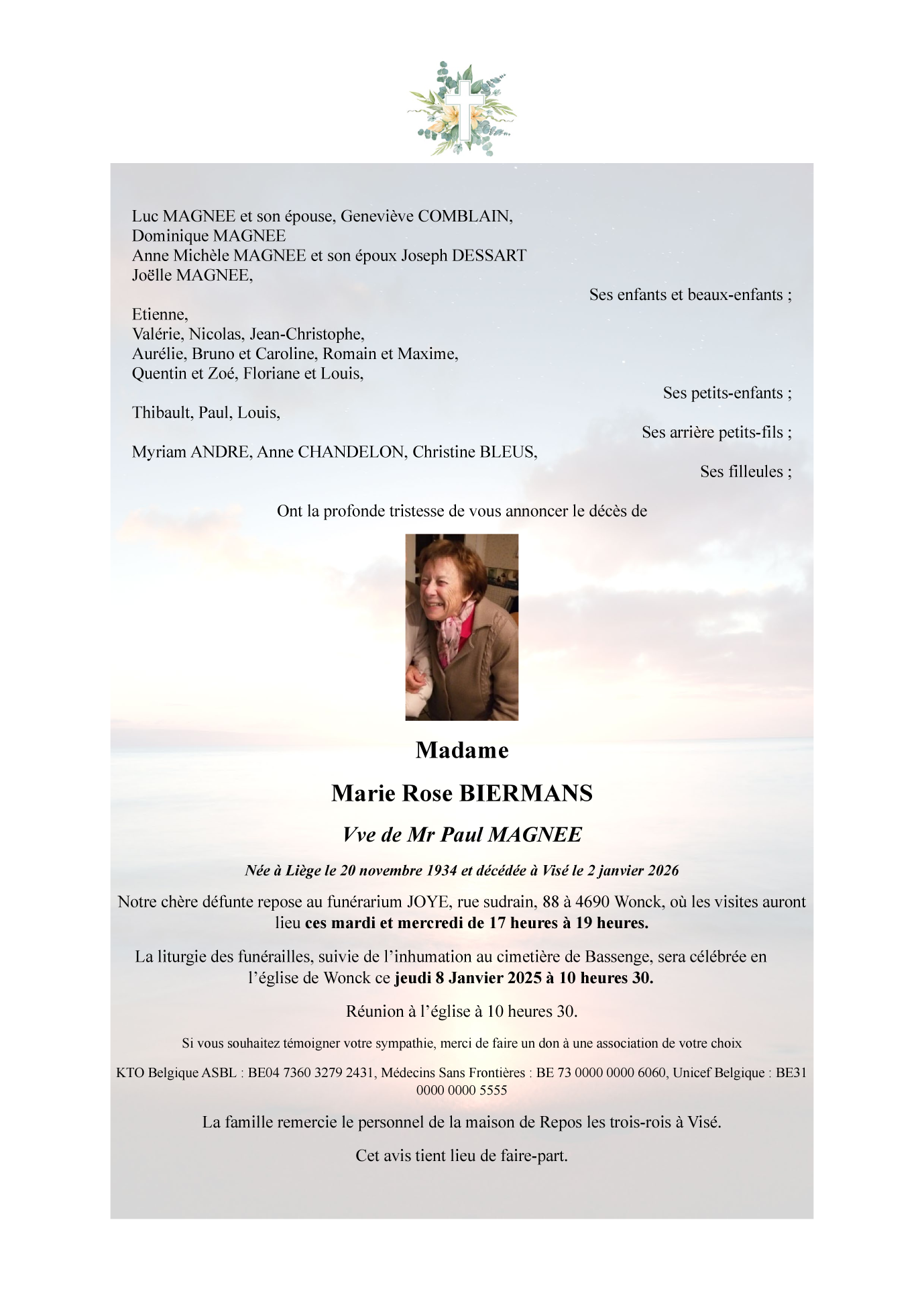 Décédée à Visé (4600, Belgique) le vendredi 2 janvier 2026 à l'âge de 91 ans