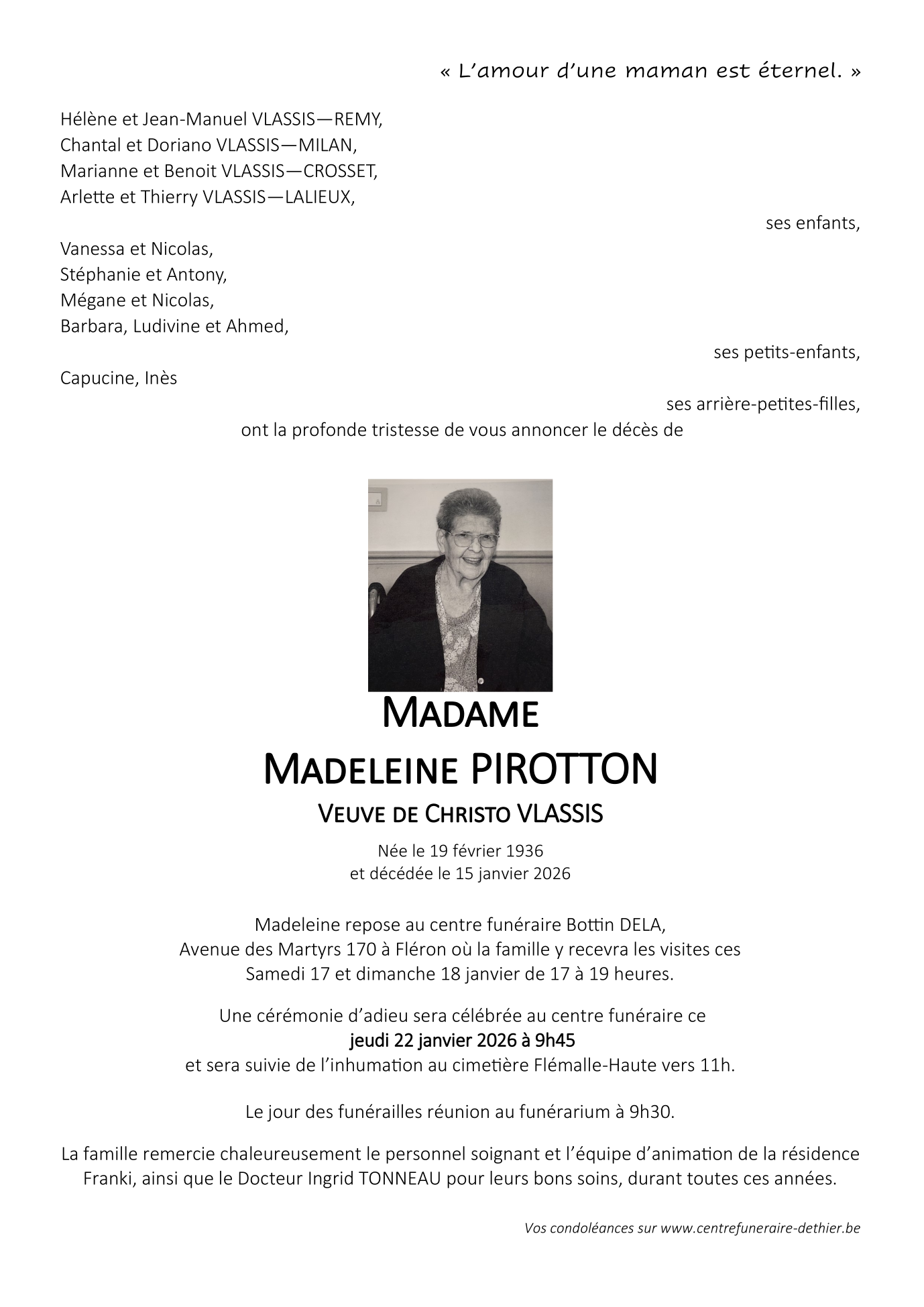 Fallecida en Liège (4020, Bélgica) el jueves, 15 de enero de 2026 a la edad de 89 años