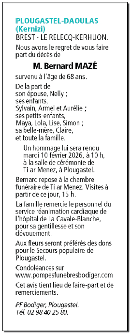 Décédé à Brest (29200, France) le jeudi 5 février 2026 à l'âge de 68 ans