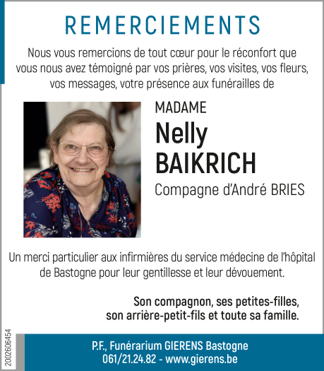 Décédée à Bastogne (6600, Belgique) le jeudi 19 février 2026 à l'âge de 77 ans